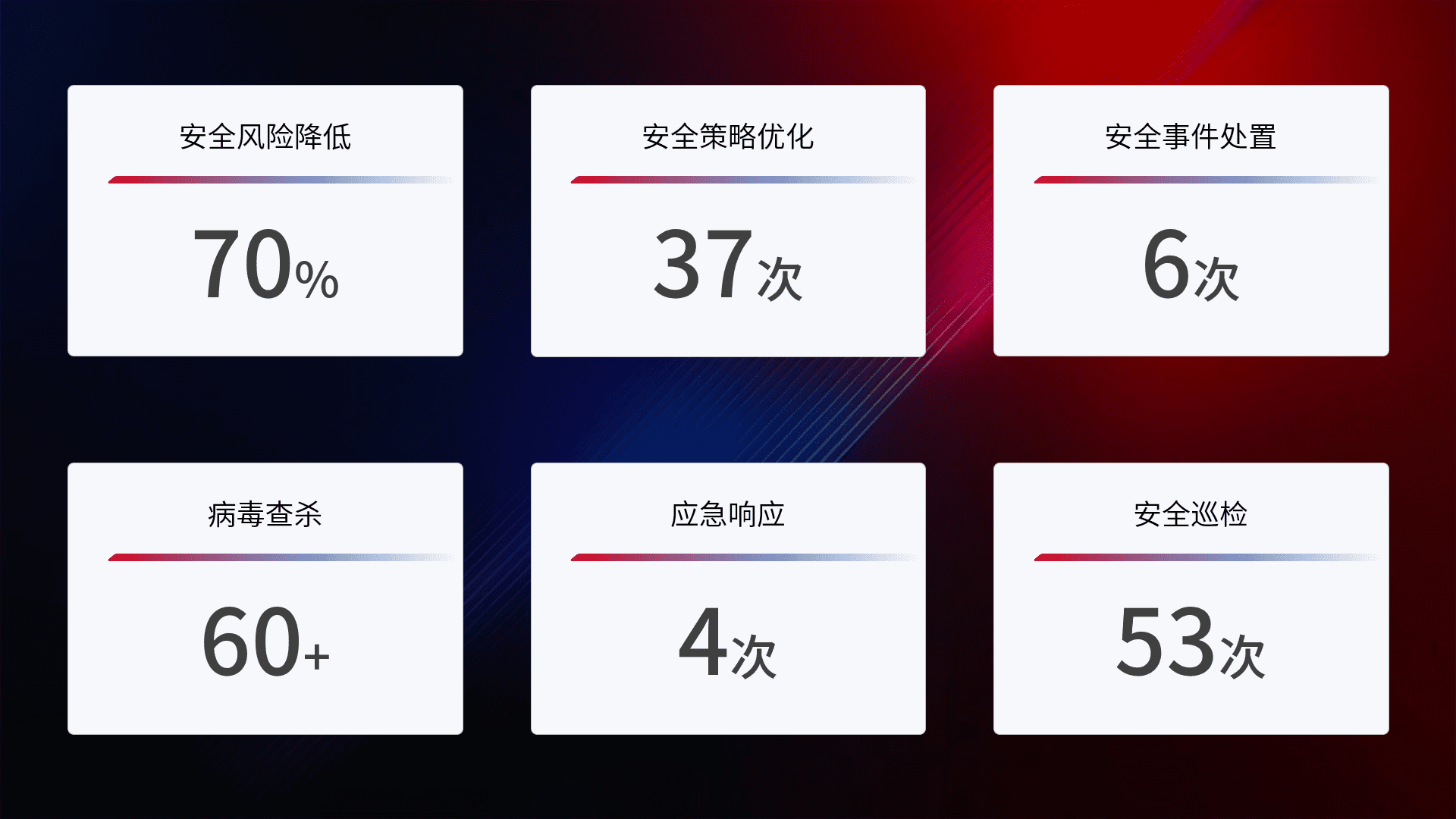 提供全面的安全事件报告体系,,,,包括处置报告、、、周报、、季度和年度总结,,,,结合持续监控,,,帮助客户深入了解网络安全状况。。